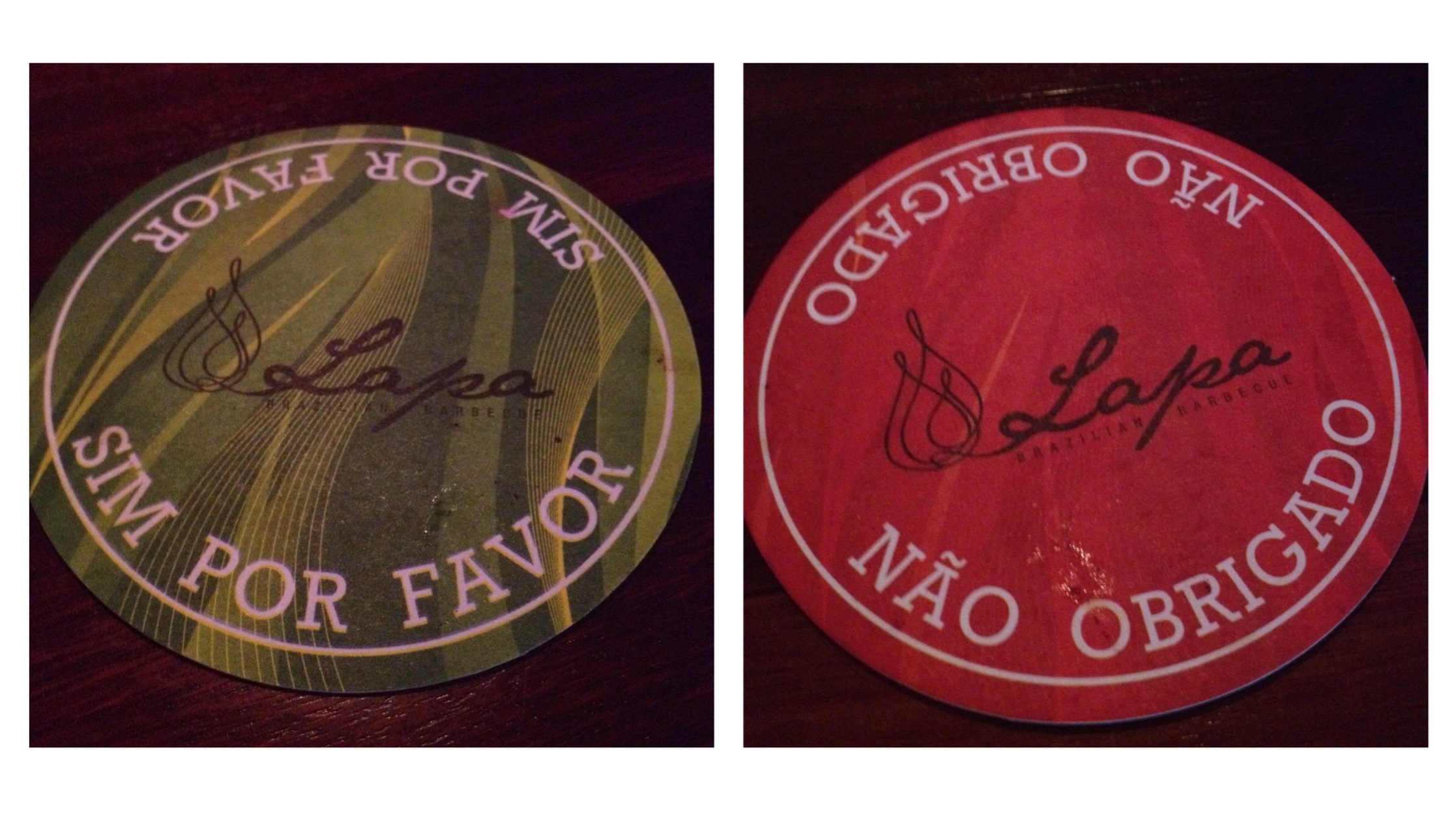 Each of us were given coasters which you can flip on either side. The green side of the coaster means that the Passadores will continue to carve meat for you while the red indicates that you had enough; similar to traffic lights like green to go and red to stop.