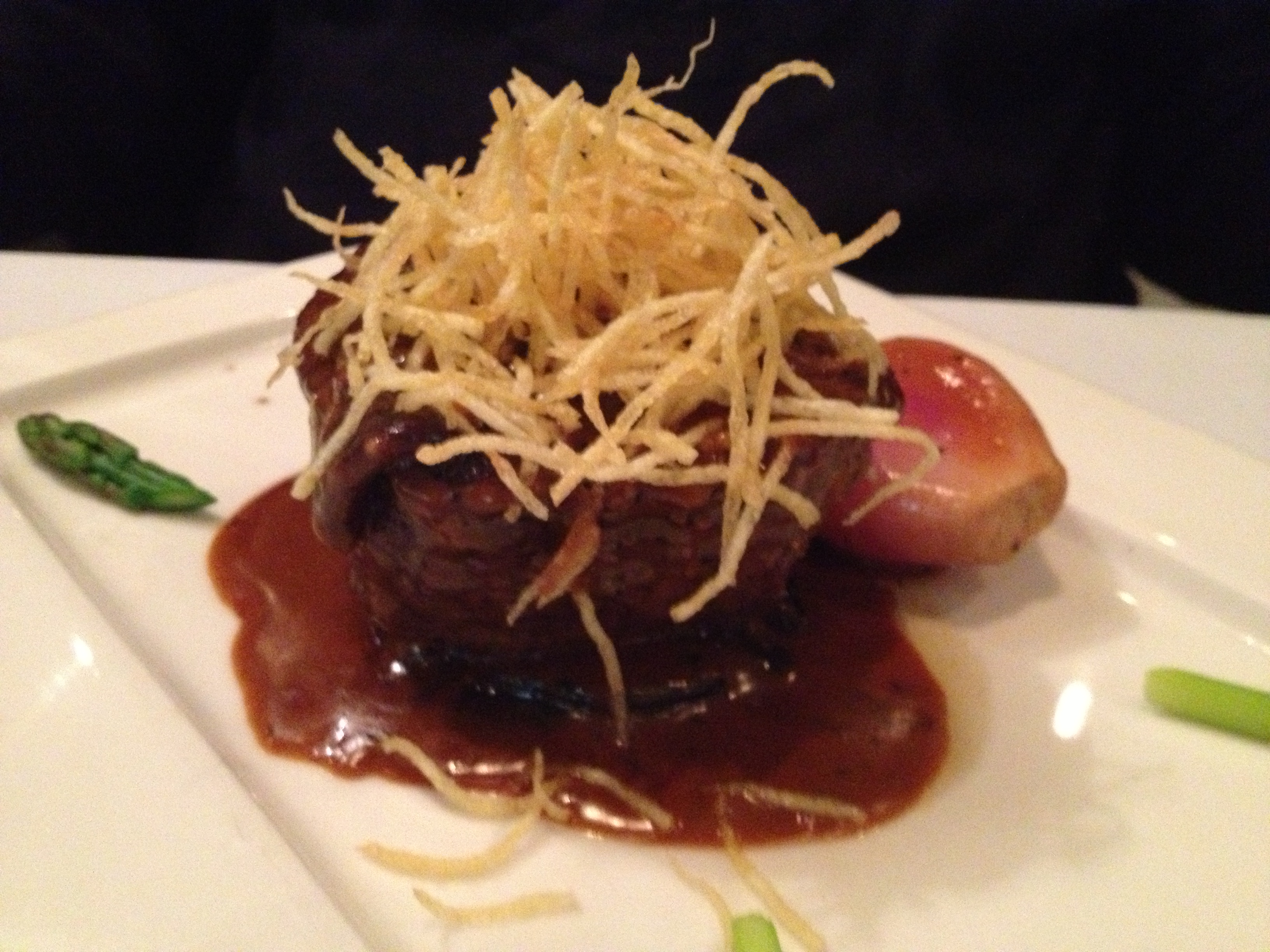 I had a taste test of dad and mum’s mains and enjoyed both of their mains as it was as good as my Scotch Fillet. Dad’s Fillet De Bouef is a Brandy flambéed eye fillet served on a grilled herb infused field mushroom, blanched asparagus, glazed shallot onions, pomme paille, a woodear and red wine jus and watercress. Like my Scotch Fillet, it was cooked perfectly at medium rare with a hint of red in the middle, making the meat tender and juicy.