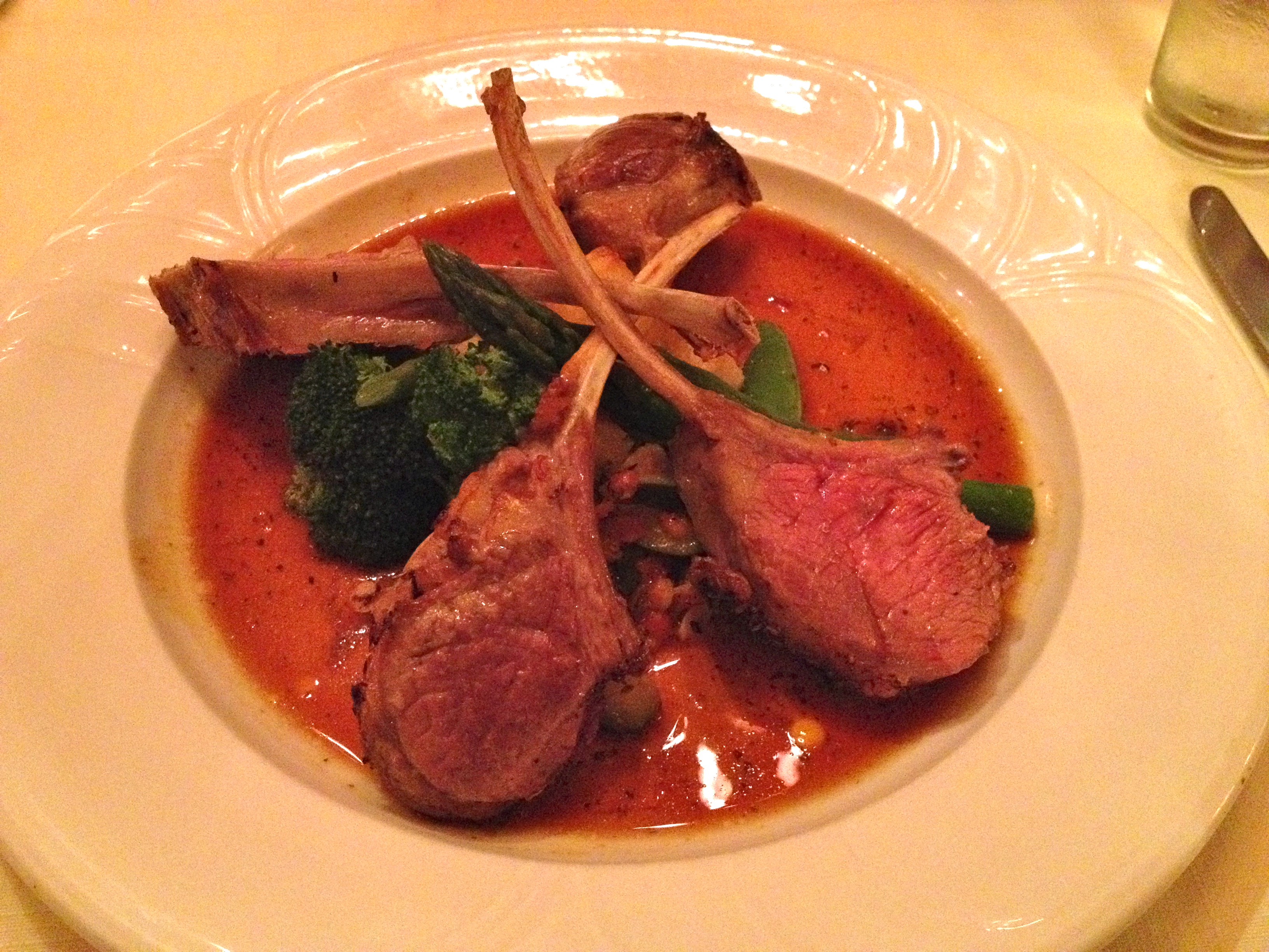 For the mains, I had the Carved rack of Spring Valley Lamb roasted and served with mint jus ($38). The Lamb was very delicious and tender. The mint jus, gave the lamb a great flavour. The serve of mash potatoes with the rack of lamb was very nice too. It looked grilled on the outside but one bite and it was soft and creamy on the inside. Dad had the Escalope of Green Mountain grass fed Veal sauteed with Brandy, mushrooms and hazelnuts ($36). I tried a bit of dad’s mains and I thought that the veal was cooked well just like the lamb and was full of flavour. Mum had the Magret Duck steak with Tamarind glaze and Orange and Grand Marnier sauce ($36). Mum seemed to enjoy her dish and thought that it was very good. The duck was cooked perfectly leaving a hint of pink in the middle.