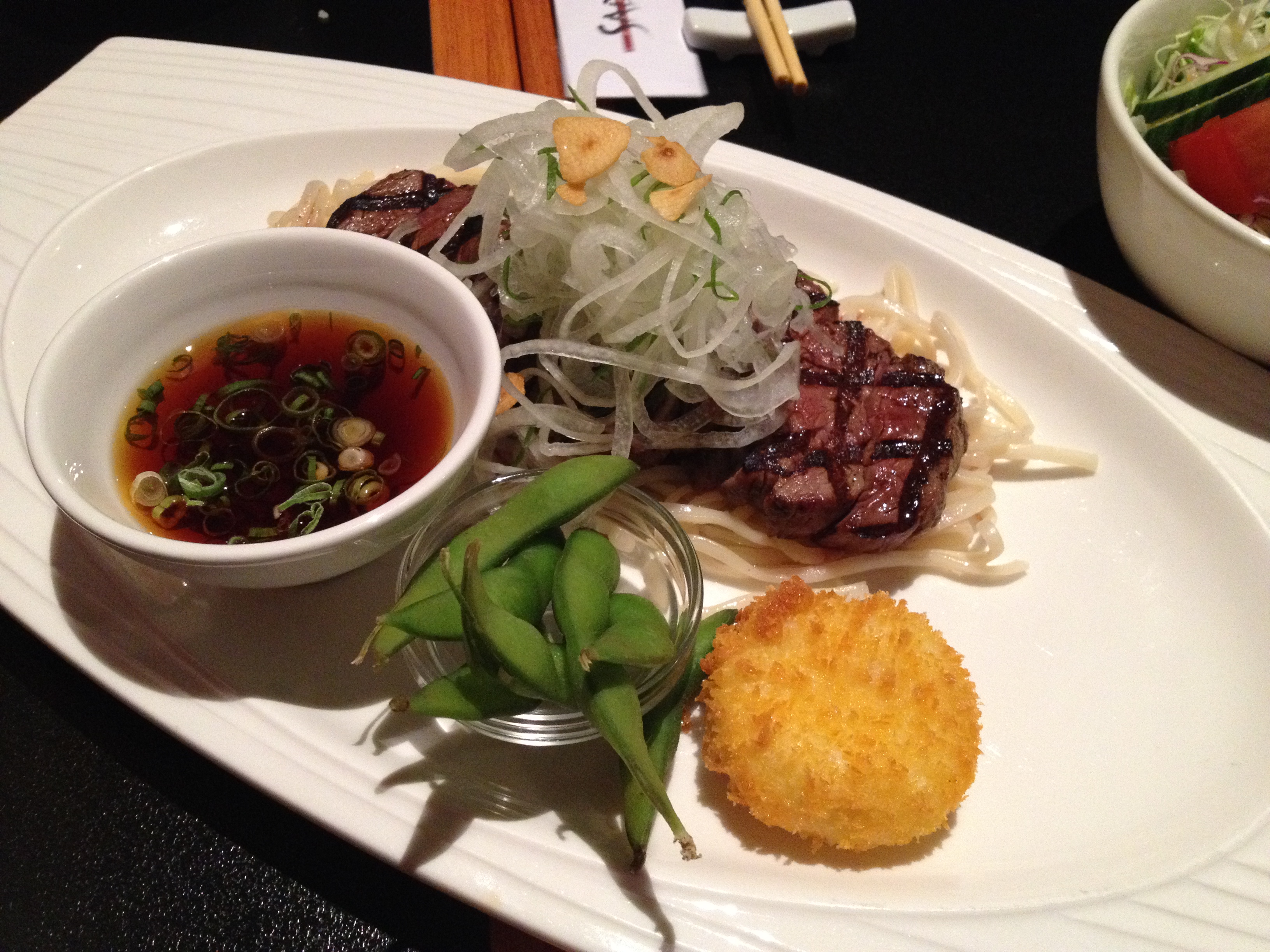 Our mains arrived. We had the sushi ($36) and sashimi ($37) mains and the Sumiyaki Beef main with rice and salad ($36) to share. The sashimi arrived with an assortment tuna, salmon, yellow tail and octopus and the sushi comprised of tuna, yellow tail, salmon, prawn, egg, tuna roll and california roll. Both the sushi and sashimi were very fresh and were executed perfectly. The Sumiyaki Beef main is a char grilled beef tenderloin served with lime flavoured soy-sauce. The Sumiyaki Beef was cooked perfectly and was very tasty. The lime flavoured soy-sauce complemented the Sumiyaki beef well giving a tangy hint to the beef.