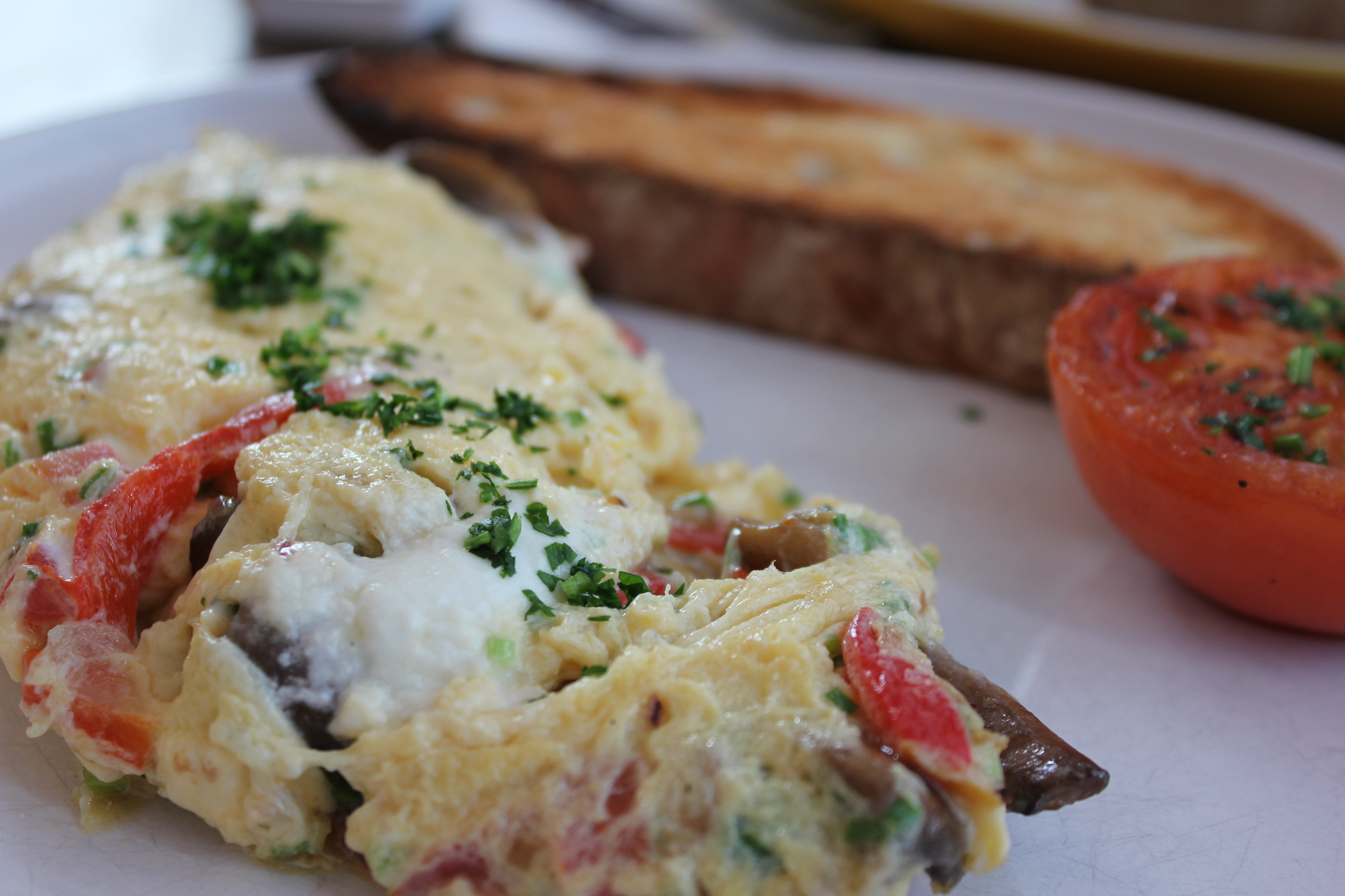Mum had the Mushroom Omelette with roast capsicum, tomato, goats’ cheese, onion and toasted sourdough ($15.50). Mum enjoyed her omelette very much and thought that it was very light, fluffy and tasty and that there was a generous amount of ingredients in the omelette. It was very lovely.