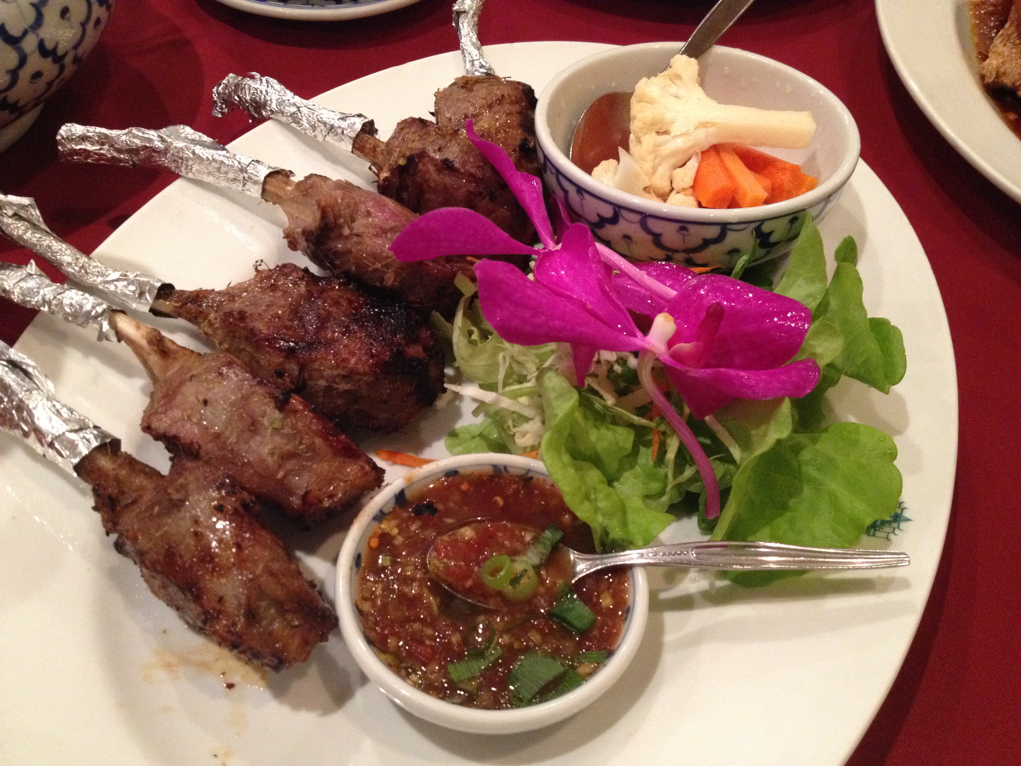 Not long after, our mains arrived. We had the Lamb Rack and a Red Duck Curry. The Grilled Lamb Racks ($36) were marinated in Thai herbs and served with Nam Jin Jaew (Thai Dried Chili Dipping Sauce) and pickled vegetables. The Lamb Racks was cooked to perfection and the meat was soft and tender. It was marinated very well and was very flavoursome! Together with the dipping sauce, it added a punch of flavours to the lamb rack.