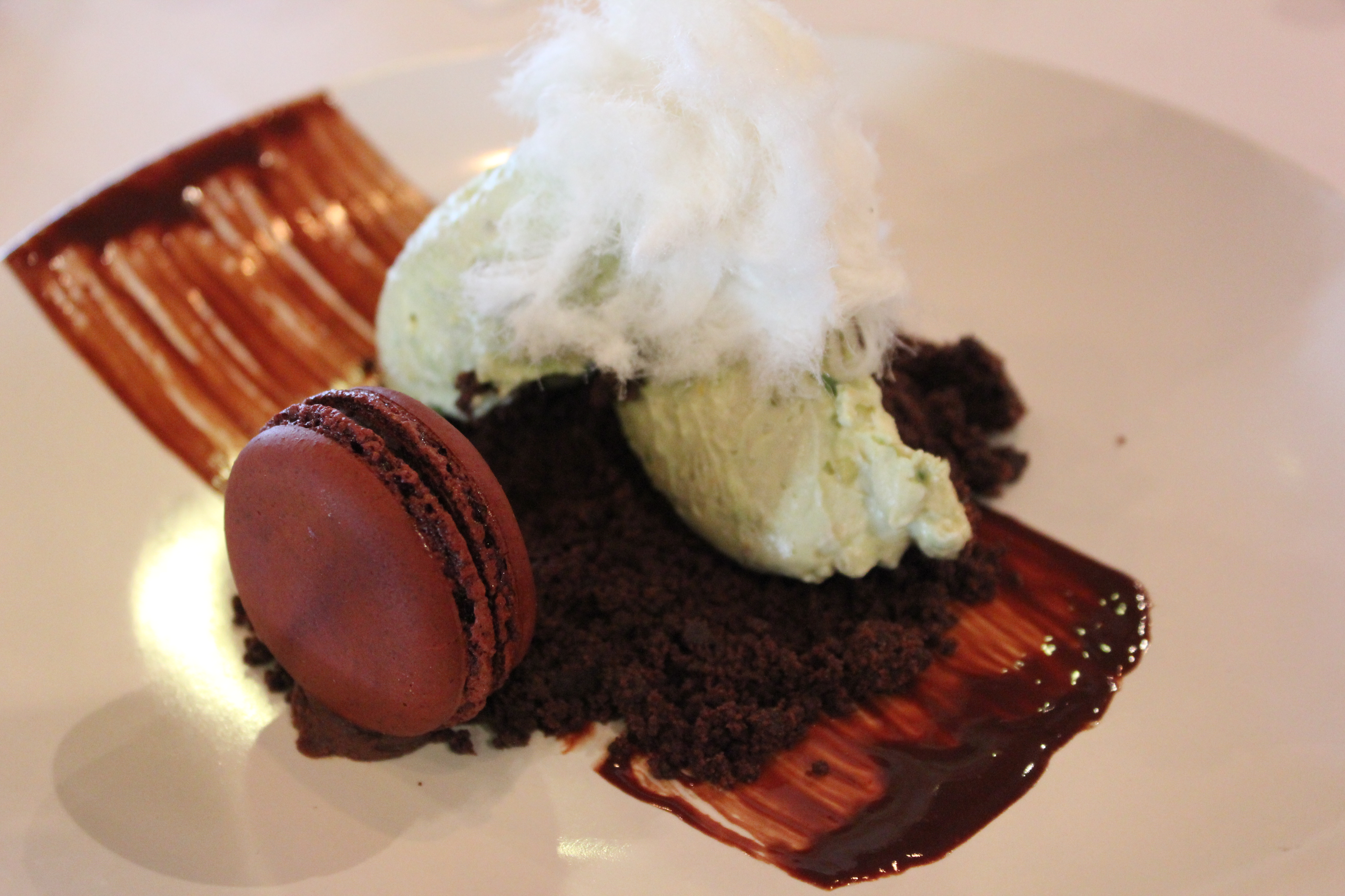 Avocado Cheesecake with Chocolate Crumbs, Chocolate Macaron and Pasmak
