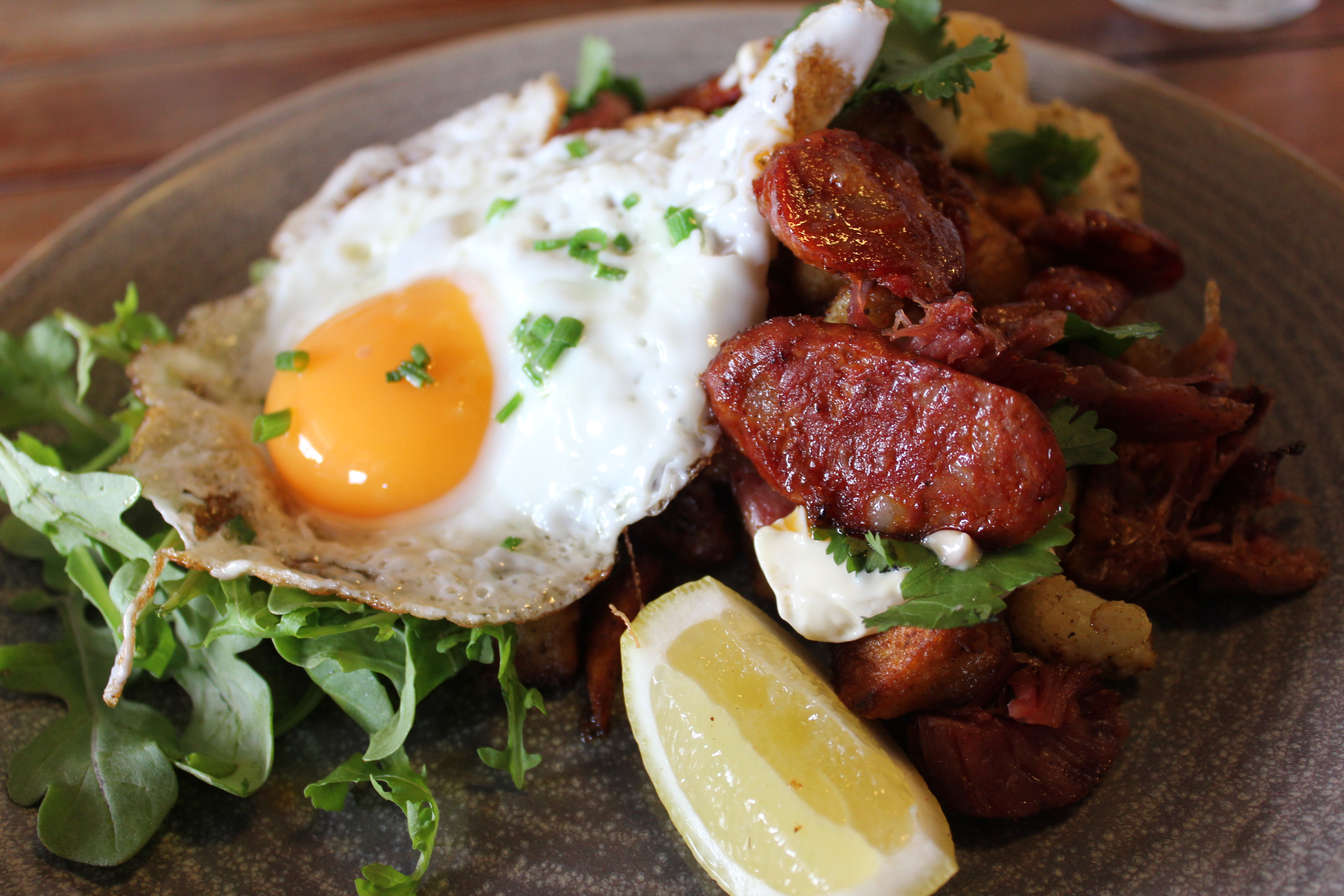 Smoked Pork Hock, Chorizo and Potato Hash with fried egg, quince and aioli