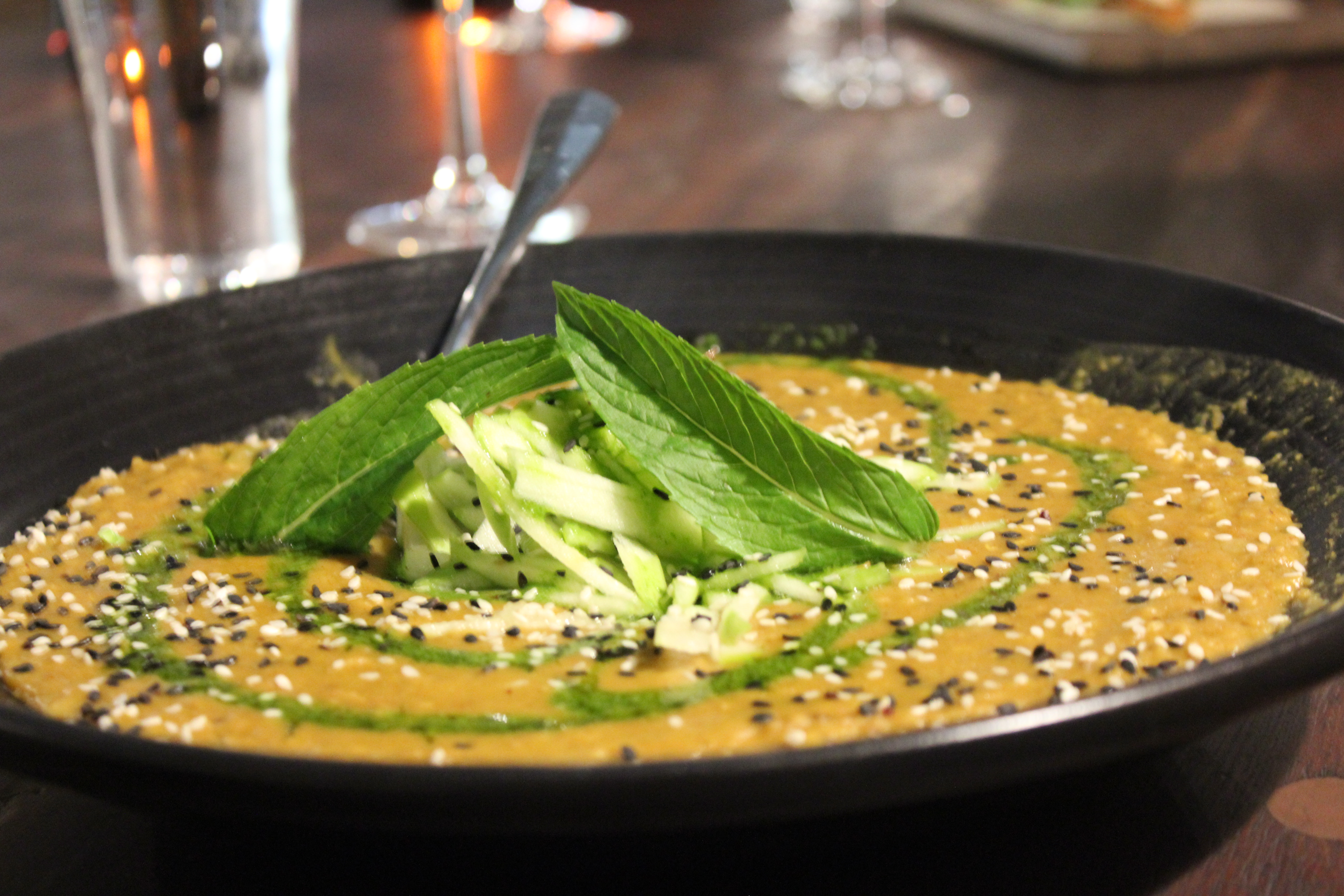 Lentil dahl with mint oil, sesame seeds and shaved green apple