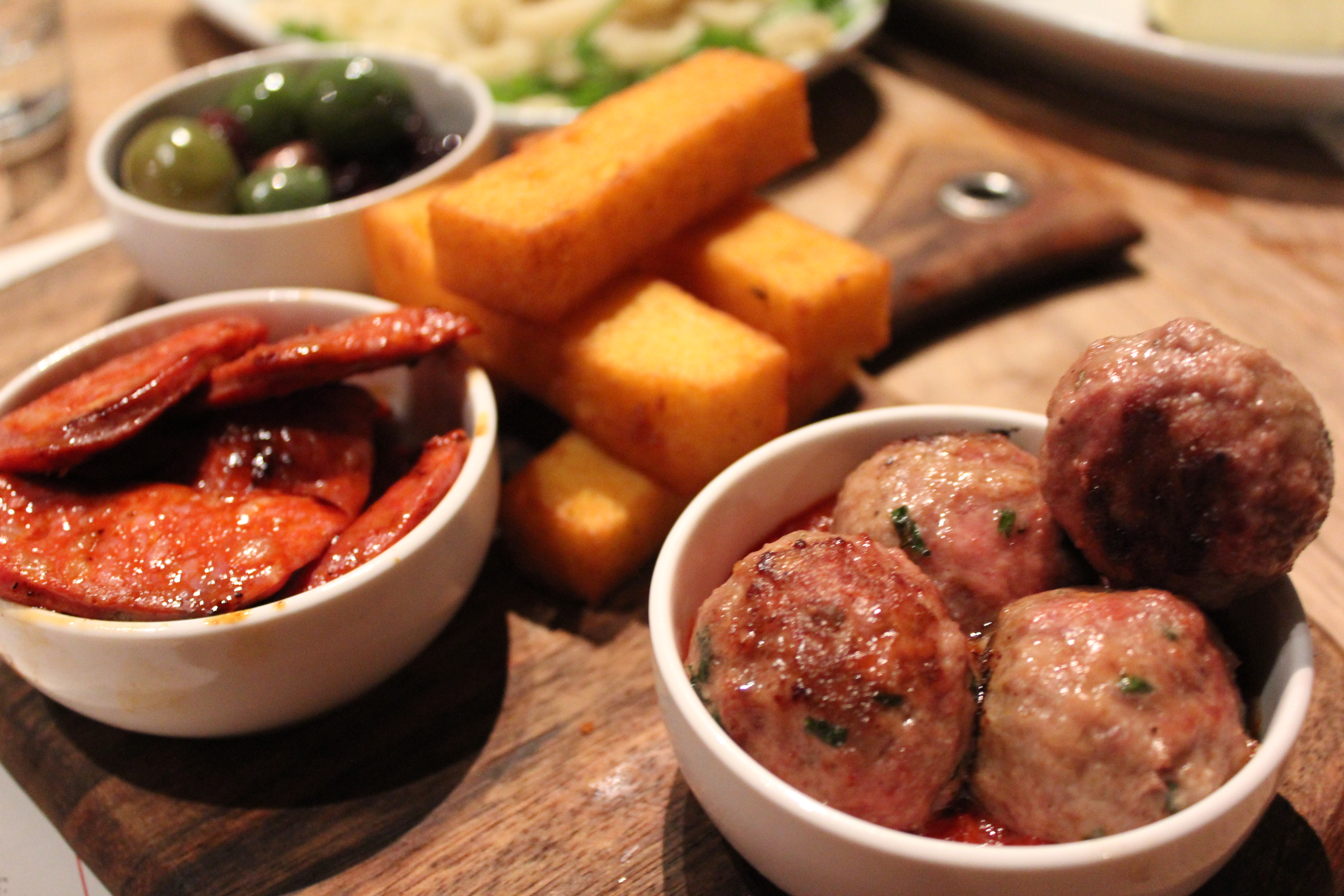 Veal meatballs, chorizo, mixed olives and polenta chips