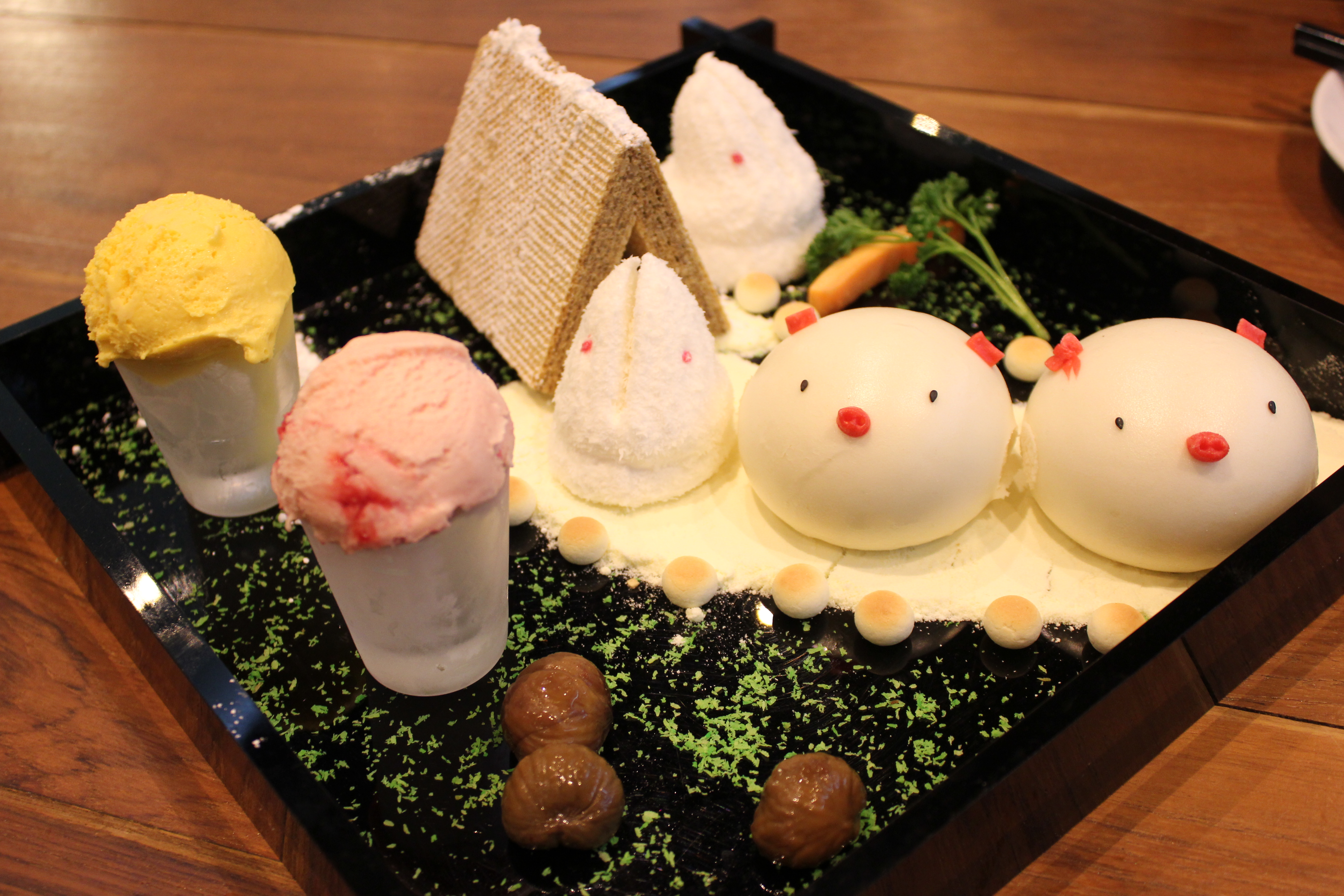 We did manage to finish our dishes but we also did reserve some space for dessert. We shared the Signature “Piggy Face” sesame bun and “Totoro” marshmallow arranged in an edible garden setting and served with ice cream, water chestnuts and wafer ($21.90). Could this be the cutest dessert ever? You bet it is! It was so beautifully presented with attention to detail. All three of us had a good three minutes staring and snapping photos of this beautiful dessert. It was too beautiful to be eaten!