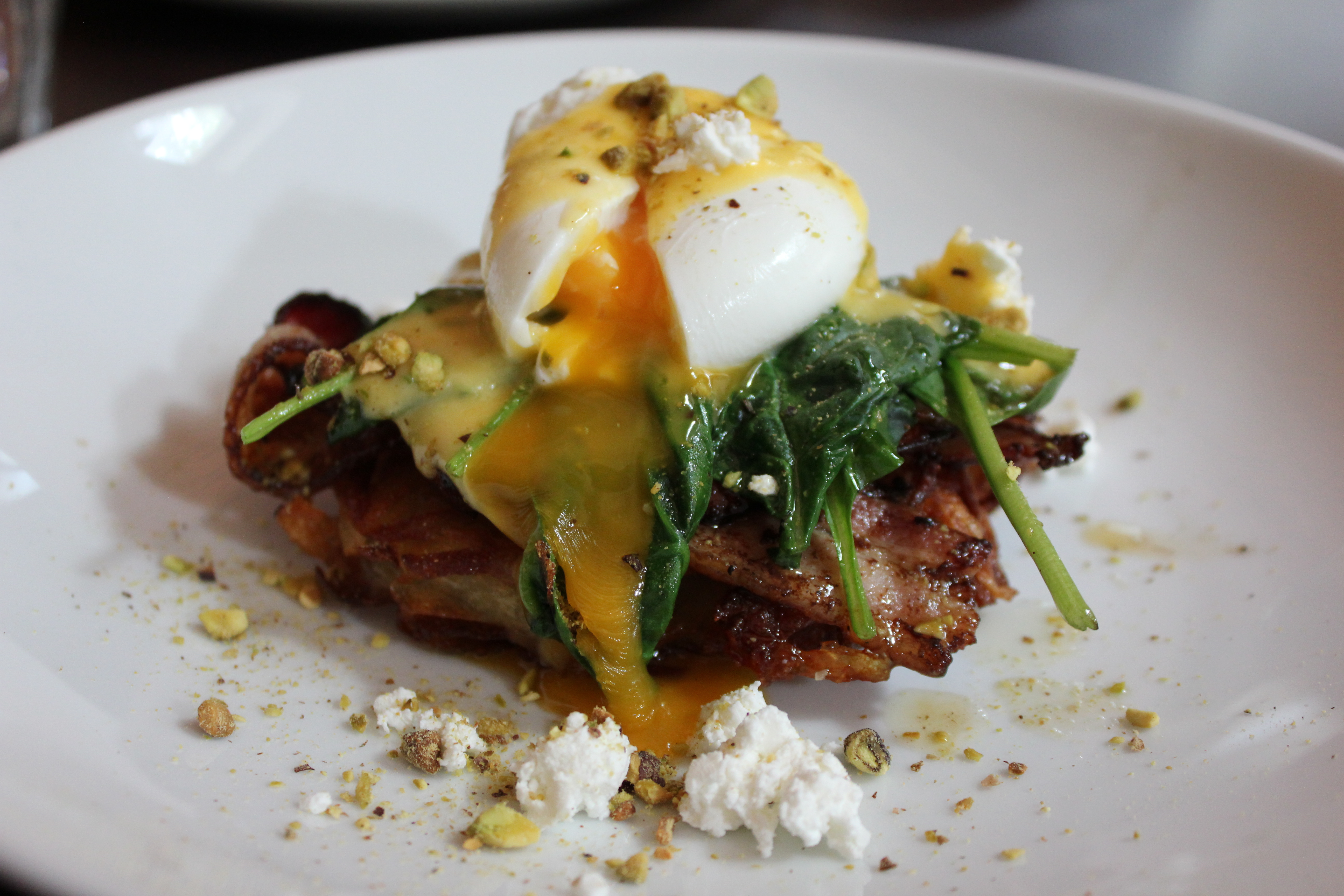 Potato Rosti with smoked house bacon, spinach, feta, poached egg, hollandaise sauce and pistachio