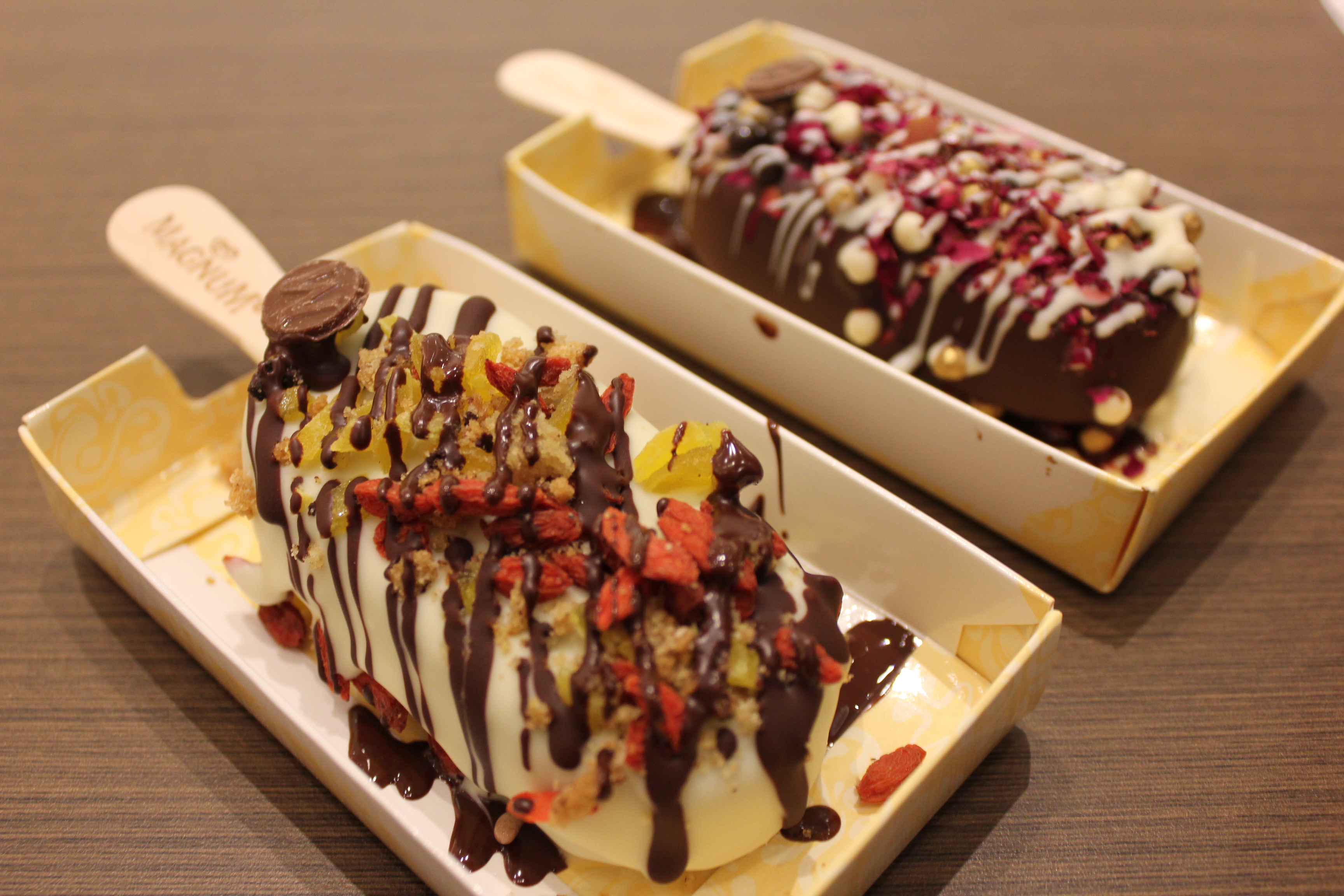 Still can’t decide? You can also choose from the many pre-designed Magnum from their menu which also costs RM9.90. Mum had the Sweet Fantasy which comprises of Chocolate Brownie ice cream, white chocolate with toppings of dried mango, goji berries and chocolate chip cookies, drizzled on top with dark chocolate.
