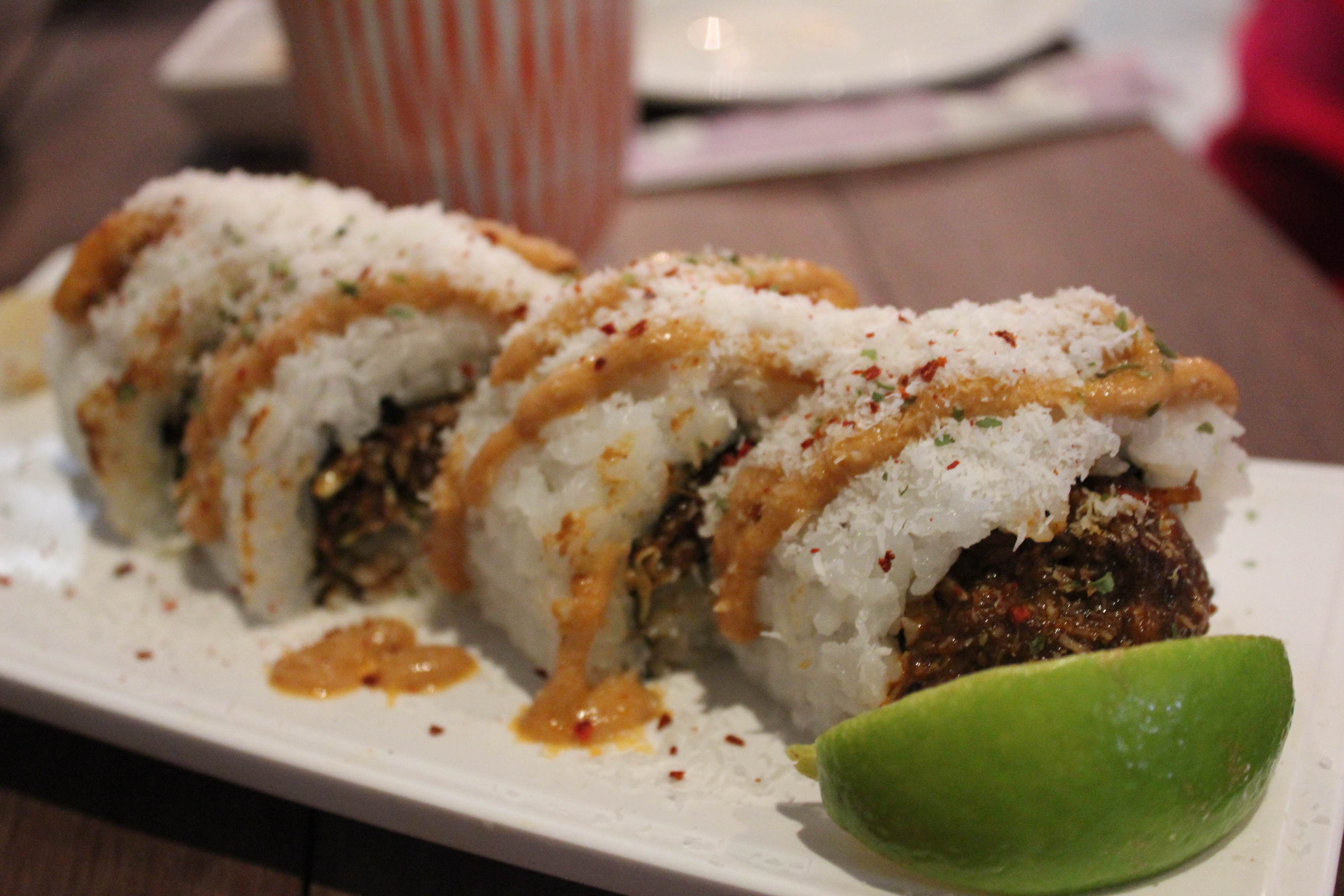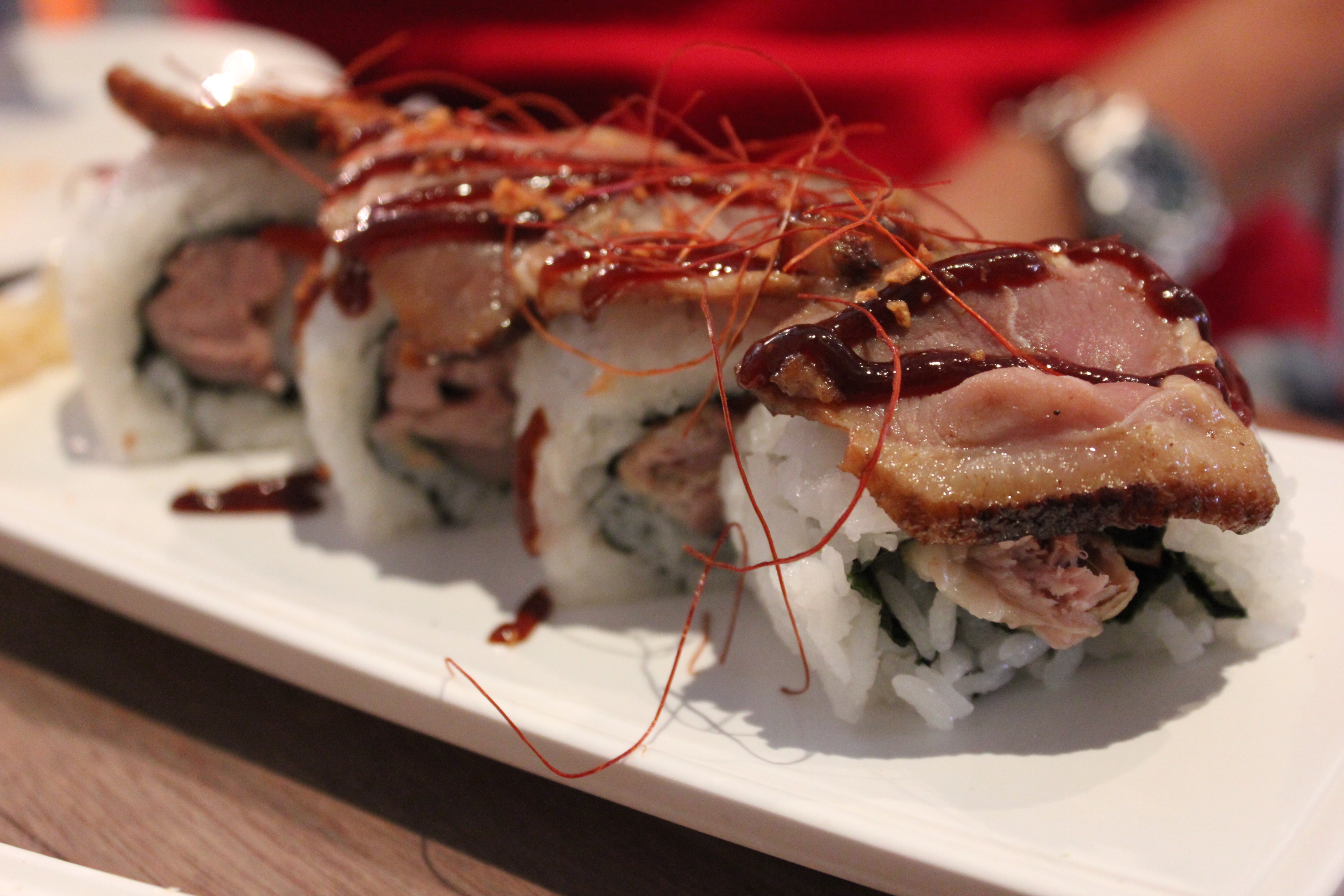 Not long after, our rolls arrived and each of the sushi rolls were quite large in size. We had the Naughty Coconut Roll (Small for $11) which comprises of lamb with sweet potato salad and lettuce, dressed with coconut tamarind sauce, topped with chilli and coconut flakes and served with lime. I thought this sushi roll was interesting – it feels like “Nasi Lemak” in a form of a sushi roll from the coconut flakes and the tenderness of the lamb pieces, similar to a rendang. To my surprise, the flavours actually do work together quite well and it was very tasty.