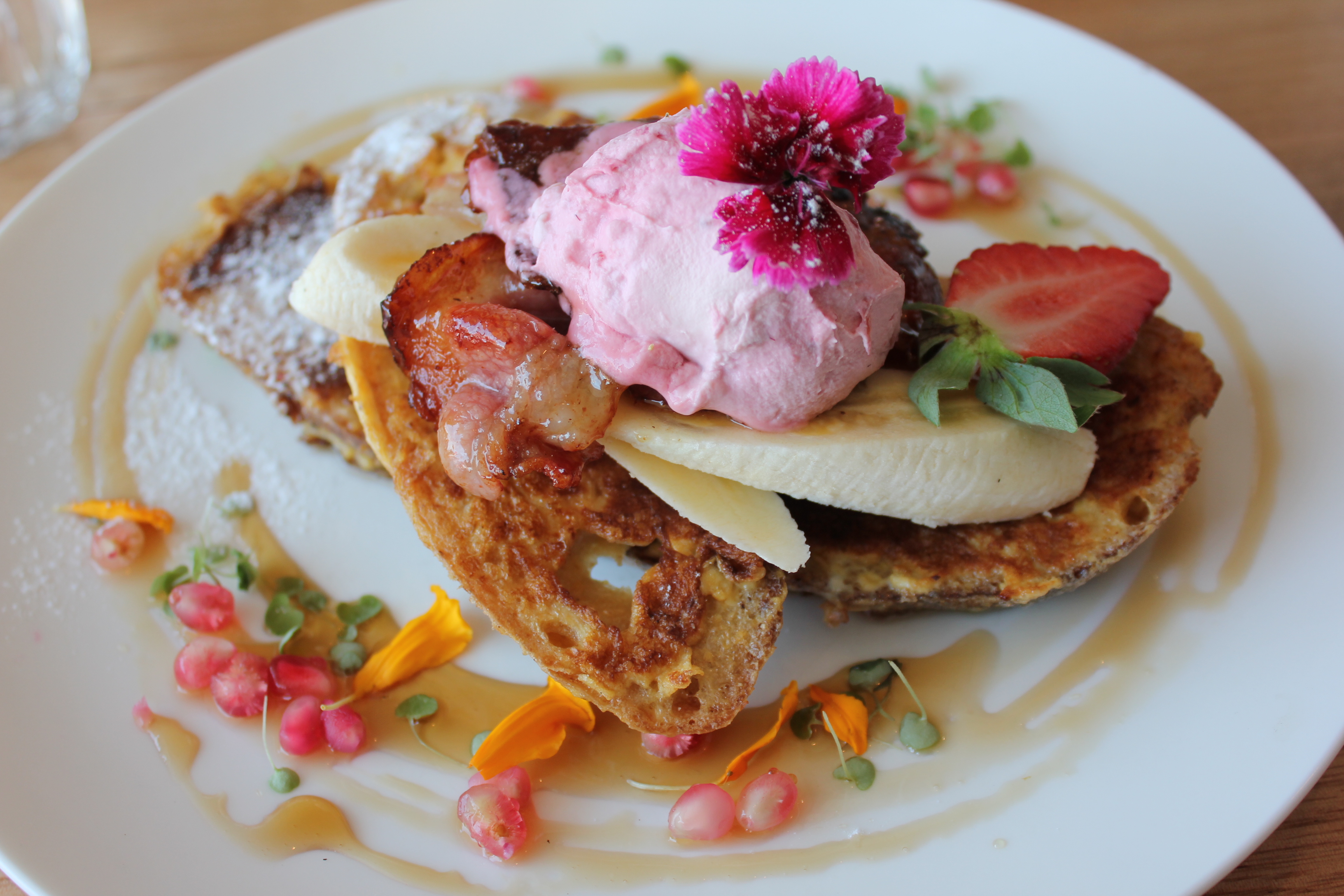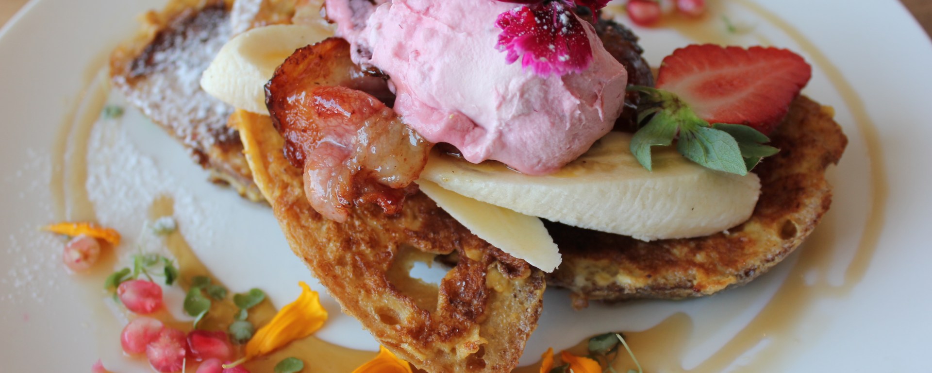 Sweet french toast with fresh banana, house cured maple bacon and raspberry mascarpone