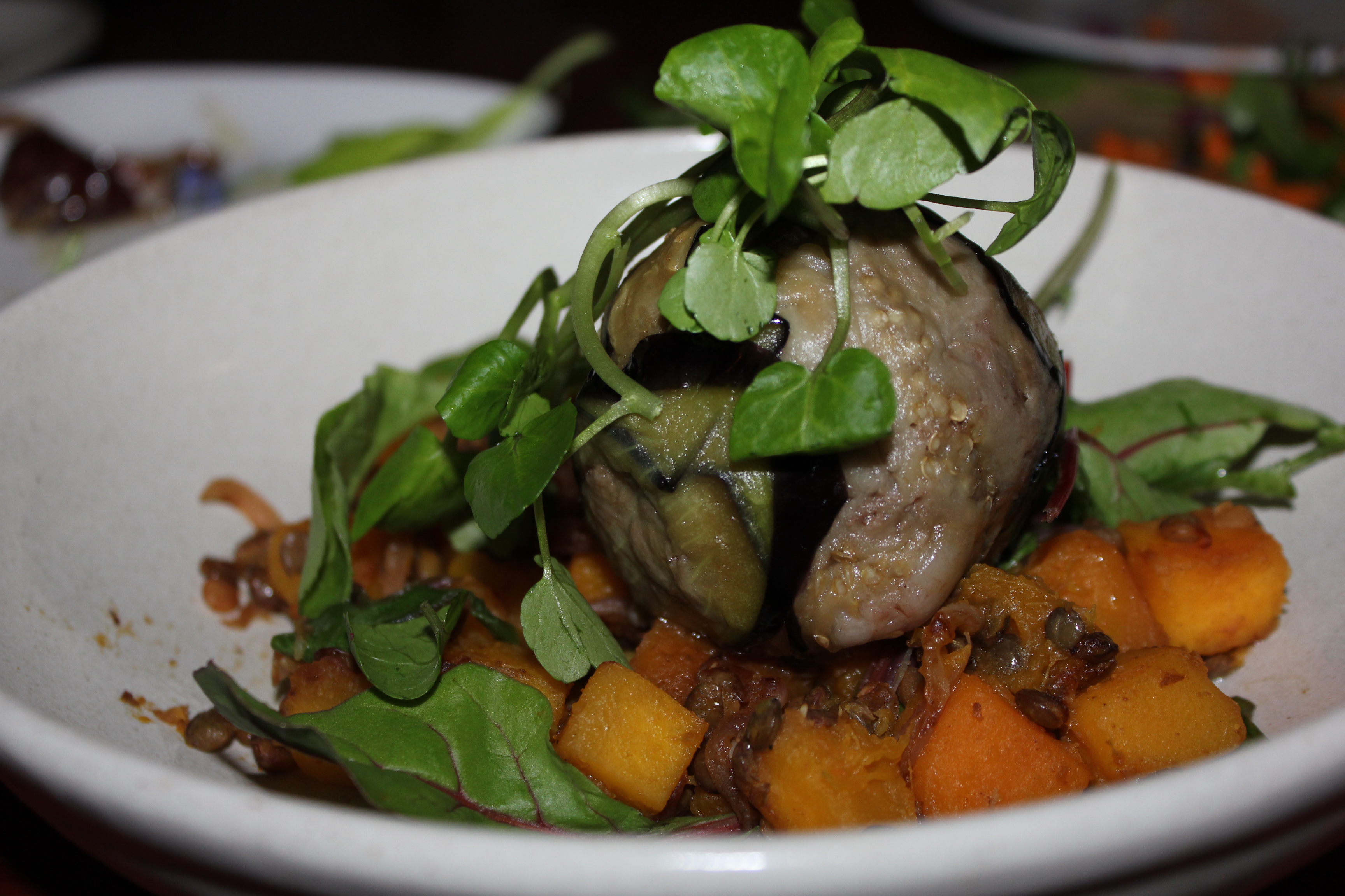 - Slow cooked braised lamb parcel, pumpking and lentil watercress salad ($28)