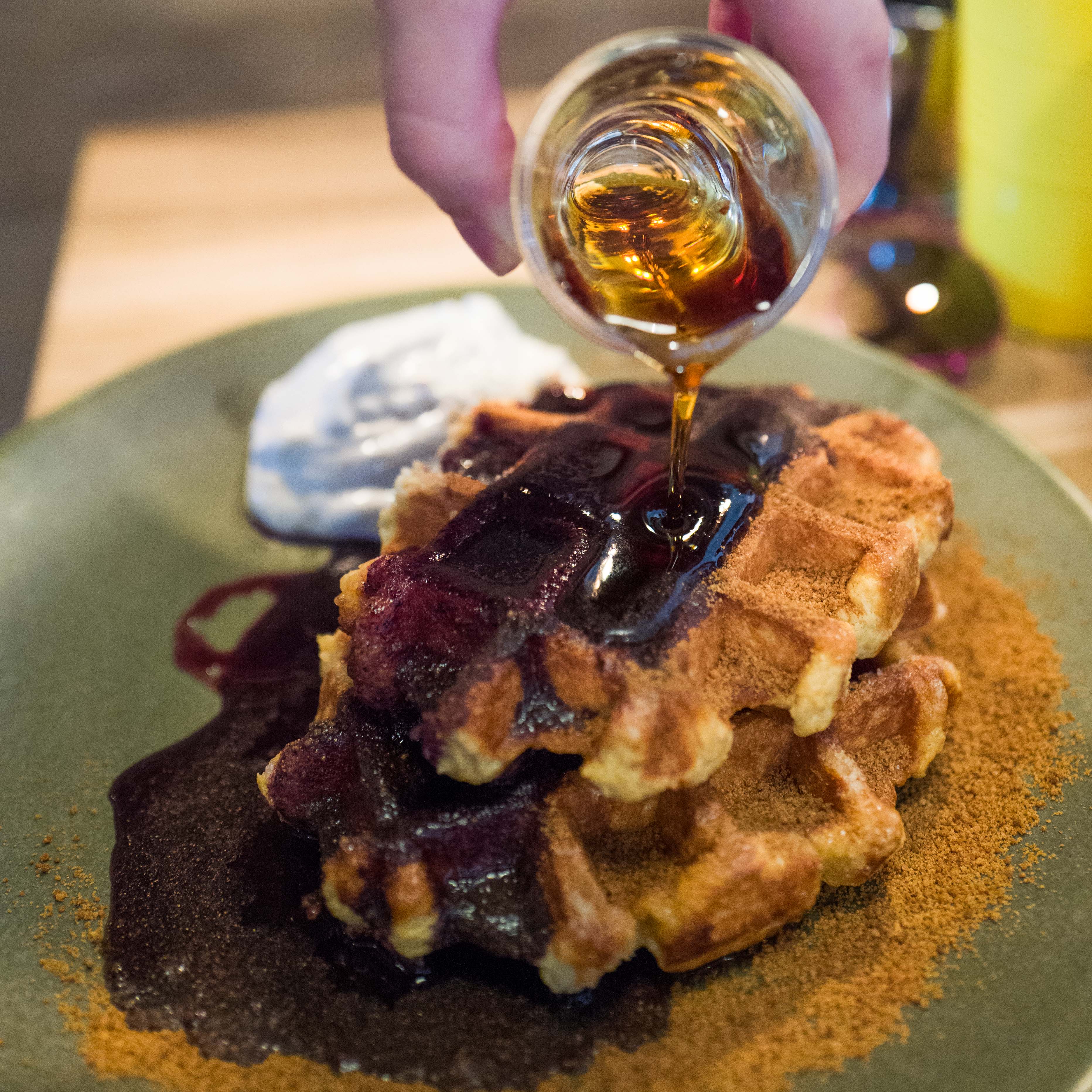 As the guys had their savoury dishes, I opted for a sweet dish which was the belgian style waffles, cinnamon sugar and blueberry syrup ($14.50). The waffles were soft and fluffy with a little crisp around the edges. Yes, I am a sucker for cinnamon and I love the strong cinnamon flavours from this dish. The blueberry syrup on top gives a hint of sweetness to the waffles and surprisingly, the flavours marry well with each other.